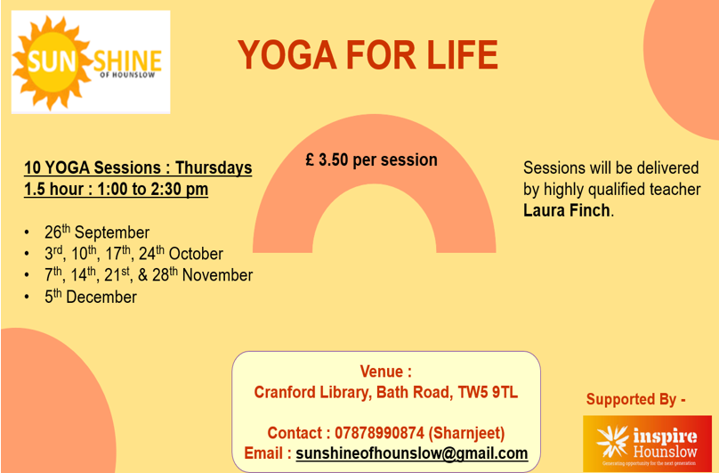 Sessions will be delivered by highly qualified teacher Laura Finch. £ 3.50 per session. 10 YOGA Sessions : Thursdays (1.5 hour : 1:00 to 2:30 pm) 26th September 3rd, 10th, 17th, 24th October 7th, 14th, 21st, & 28th November 5th December
